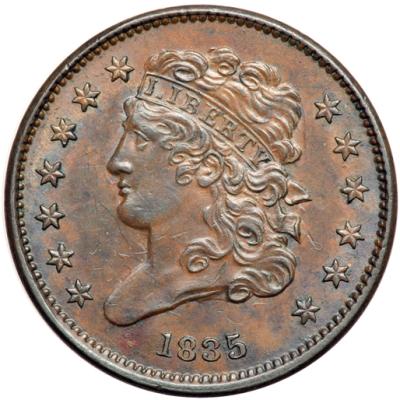 1835 C-2 R1 AU55. Frosty mottled mix of medium steel brown and darker olive with traces of lighter brown and tan faded down from mint color on the reverse. A thin nick on the truncation above the 5 in the date is the only notable mark. LDS, Manley state 3.0, with a fine die crack arcing across the upper half of the reverse.