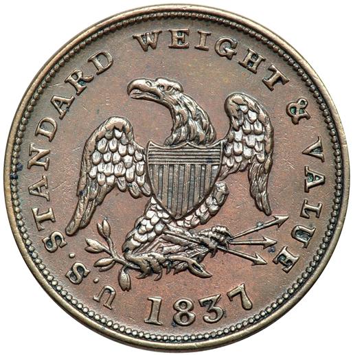 catalog Auction info Buyers Premium of 20.00% added to each and every lot September Pre-Long Beach Auction(#70) 09/02/2012 9:00 AM PDT CLOSED! Lot 348 of 3963: 1837 Hard Times Token Low-49 Rulau HT-73 R2 AU58 Click image to enlarge PreviousNextSimilar Items Lot closed - Winning bid:$600 (6 bids) Estimate: $300 Remove from watchlist Add to watchlist Tell a friendAsk a question September Pre-Long Beach Auction(#70) 09/02/2012 9:00 AM PDT CLOSED! Description Description: 1837 Hard Times Token Low-49 Rulau HT-73 R2 AU58. Choice glossy steel brown and chocolate. Smooth and nicely struck. Just a hint of rub on the highest points from mint state, and the eye appeal is excellent. Must be an early strike as the fields are hard and slightly reflective on both sides. A premium example of this popular half cent token. Estimated Value $300-UP. Ex Stack's 3/18/1986:808-Stack's 6/7/1990:1169 (both lot tickets included). Categories: The Carvin Goodridge Collection of Half Cents