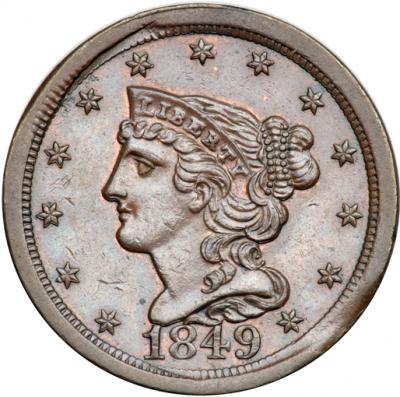 1849 C-1 R2. PCGS graded MS-62 Brown. Glossy light to medium chocolate brown with traces of mint red remaining on both sides. There are a few very tiny ticks on both sides, none notable. EDS, Manley state 1.0. The fields on both sides are slightly reflective. This planchet was improperly cut from the strip leaving a planchet cutter impression in the dentils at stars 5-6 and a void at the rim at stars 12-13 that caused the dentils in that area to strike very weakly.