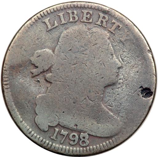 1798/7 S-151 R3 Overdate 8 over 7 AG3. Slightly sharper but there is an eye-catching dent near the rim before the neck. Otherwise the surfaces are nice for the grade, just well worn. Glossy chocolate brown and steel, possibly retoned. The date is bold and the overdate is obvious to the unaided eye. M-LDS with areas of obvious swelling on both sides.