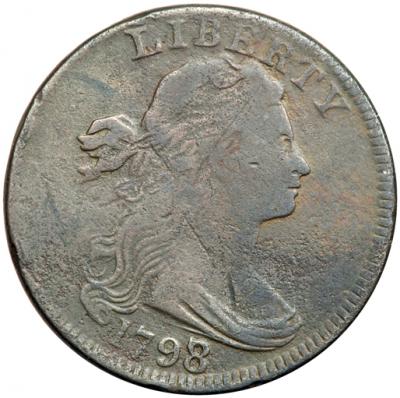 1798/7 S-152 R2 Overdate 8 over 7 VG7. A few points sharper but the surfaces are dull from extremely fine roughness, strongest in the field before the neck. No verdigris. The notable marks are a dull nick on the bust, a light rim bruise at the D in UNITED, and a pinprick at the dentils over the M in AMERICA. Dark olive brown and chocolate. The date is clear and the overdate is obvious. The legends are complete and easily readable.