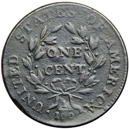 1800/798 S-191 R3 Overdate 800 over 798, Style I Hair VG10. Sharpness VF20 but covered with very fine roughness under a slightly glossy dark olive and steel patina. No notable verdigris, but there is an obvious scrape on the rim over UNI. MDS, Breen state IV. The reverse die shows obvious swelling at the fraction and ON but those elements remain easily readable.