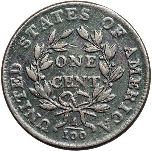 1800/79 S-192 R3 Overdate 80 over 79, Style II Hair F15. Ten points sharper but there are some light hairline scratches on both sides, all rather well hidden under a glossy dark olive brown and steel patina. The notable scratches are on the cheek, bust tip, and single one at OF-A. M-LDS, Breen state IV early. The date and overdate are bold. A decent example of this popular overdate in spite of the minor imperfections.