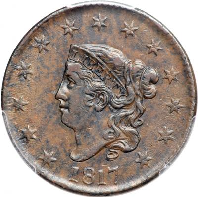1817 N-2 R3. PCGS graded AU-55. Lustrous medium brown mottled with splashes of darker olive brown and steel toning on both sides. No roughness or verdigris, but there are a few rim nicks on the reverse, including two under the end of the wreath stem and one more over the E in STATES. LDS with a die crack bisecting the reverse from the rim right of OF to the rim at NI in UNITED.