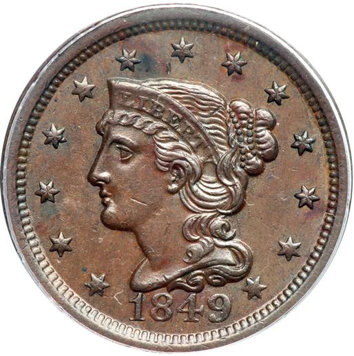 1849 N-14 R3. PCGS graded MS-63 Brown. Glossy chocolate and steel with frosty luster showing in protected areas on both sides. A splash of darker olive and steel toning at star 6 and a carbon spot under the E in UNITED are the only notable defects. LDS, die state d. The die crack at RI extends into the dentils over the adjacent E and weakly to top of the C. Called AU50 and tied for CC#18 in the Noyes census, his photo #55113.