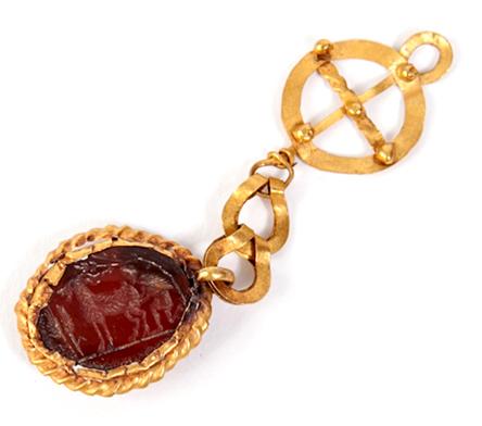 catalog Auction info Buyers Premium of 20.00% added to each and every lot December Collectibles Auction(#71) 12/01/2012 11:00 AM PST CLOSED! Lot 419 of 811: ROMAN. Carnelian intaglio. 1st-2nd century AD Click image to enlarge PreviousNextSimilar Items Lot closed - Winning bid:$625 (2 bids) Estimate: $500 - $600 Remove from watchlist Add to watchlist Tell a friendAsk a question December Collectibles Auction(#71) 12/01/2012 11:00 AM PST CLOSED! Description Description: ROMAN. Carnelian intaglio. 1st-2nd century AD. Depicts goatherd milking goat, grain ears before. Set in sheet gold bezel attached to decorative four-link chain (perhaps of later date). L: 6 cm. Estimated Value $500 - 600. Ex Joseph S. Melchione Collection. Ex Palladium Numismatics & Artifacts #8, 7 April 1995, A60. Categories: The Joseph Melchione Collection of Antiquities