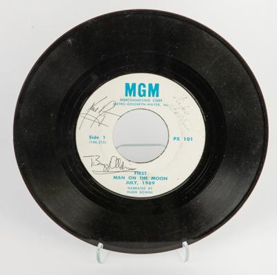 Apollo 11, Neil Armstrong, Buzz Aldrin and Michael Collins Autographs. On an MGM 45 RPM record. Titled First Man On The Moon July 1969 and Narriated by Hugh Downs, a long time broadcast Journalist. The record covers Neil Armstrong's historic departure from the LM and his first step on the Moon. All 3 autographs are in black ink. "Mike Collins" is a bit lighter. The record has a few minor scratches but is still in playable condition. We have never seen this record signed by all 3 crew members.