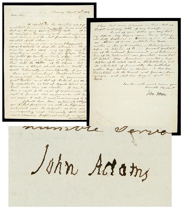 Adams, John (1735-1826) 2nd President of the United States (1797-1801). Letter signed, 2 pages (recto/verso), 8 x 10 in., Quincy, 30 April 1819. To an unidentified correspondent, with some of the finest John Adams content extant.