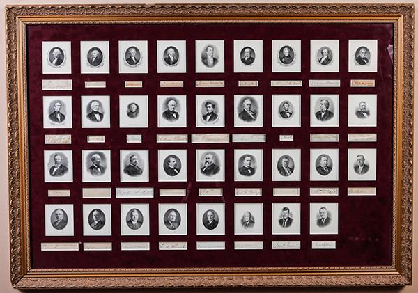 [Presidents] George Washington Through Lyndon B. Johnson, Thirty-five Signatures of the first 36 Presidents of the United States, most cut from documents. Since Grover Cleveland was the 22nd and 24th President, there is only one signature for him. Garfield's and Eisenhower's signatures are somewhat light. The signatures are matted with 3¼ x 3" steel engravings of each President above his signature, all of which are handsomely framed to an overall size of 30½ x 43½". These signatures cover U.S. presidential history from 1789 through 1969: 181 years. A wonderful display piece.
