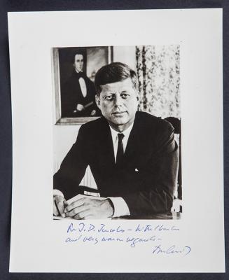Kennedy, John F, Black and white 8 x 10 in. photo signed and inscribed, " For J.D. Jacobs - with thanks and very warm regards - John Kennedy" in blue ball point pen, n.p., n.d. The photograph of Kennedy was taken at his desk in Hyannis Port, Massachusetts in August 1960 by photographer Alfred Eisenstaedt. On July 13, 1960, Kennedy had become the Democratic Party's presidential nominee, and he needed to look presidential in his photographs. Eisenstaedt was a famous photographer who had worked for Life Magazine and was best known for his photograph of a sailor kissing a young woman in New York's Times Square on Victory over Japan Day, August 14, 1945.