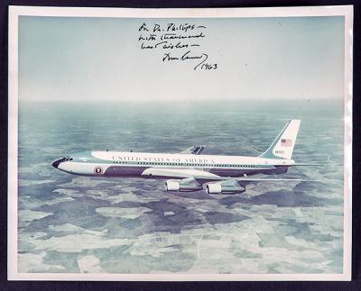 Kennedy, John F, Color photograph of Air Force One "Special Air Mission" (SAM) 26000 signed and inscribed, "For Dr. Phillips--with thanks and best wishes--John Kennedy 1963," 8 x 10 in., n.p. The President signed in black fountain ink at top center. This VC - 137 aircraft was built by Boeing Aircraft in Renton, Washington and delivered in October 1962. The first flight was made by President Kennedy in November 1962 to attend the funeral of Eleanor Roosevelt in Hyde Park, New York. The plane also carried President Kennedy's body back to Washington after his assassination on November 22, 1963, and is, consequently, considered the most historic of all of the planes called Air Force One. It was retired to Wright-Patterson Air Force Base near Dayton, Ohio in 1998.