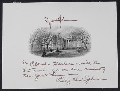 Johnson, Lyndon B. and Lady Bird, Lovely depiction of the White House during horse-and-buggy days signed "Lyndon B. Johnson" at the top, signed and inscribed at the bottom, "For Claude Harkins --with the best wishes of a one-time resident of this great house. Lady Bird Johnson," 8 x 6 in., n.p., n. d. Portrait of the White House published by the Bureau of Engraving and Printing. Excellent condition. Ex Claude Harkins Collection.