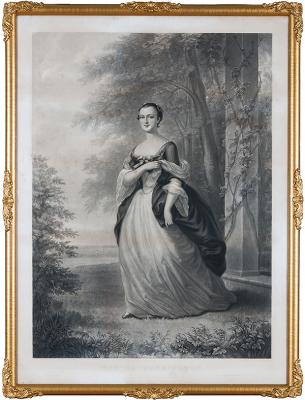 [Washington, Martha] Engraving of Martha Dandridge Custis As A Young Woman, c. 1910, Engraved by J. Rogers after the painting by John Woolaston, 26 x 19 in., in original gilt frame with original blown glass and original wood backing; engraving is 24 x 31 in. The English artist John Wollaston was in America between 1749 and 1767. During that time, he painted many of the leading figures of the American upper class including the young married lady Martha Dandridge Custis, her husband Daniel Parke Custis, and their children. When nineteen-year-old Martha Dandridge married the very wealthy 38-year-old Custis on 15 May 1750, she moved into the upper echelon of Virginia society. Custis died in 1757, leaving her a widow at the age of 26 with two small children (two other children died at the ages of 3 and 4). Custis died intestate but according to English common law, which prevailed in Virginia at the time, Martha was assured one third of the estate, the other two thirds to go to her children when they became adults. The 26-year-old widow owned some 17,500 acres of land and over 300 slaves. Less than 18 months later, she would marry George Washington. Ex Claude Harkins Collection.