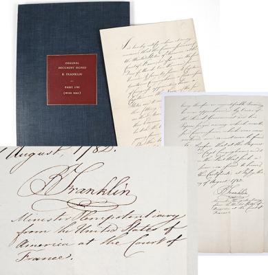 The letter is written on laid, watermarked paper. Ironically, the watermark on one page shows a robed Britannia seated beside a rampant lion within the enclosure of a picket fence; Britannia supports a spear holding a hat; to the left of the spear is "Pro Patria"; on the other page is "GR" below a crown. Fine, with a magnificent, large and bold signature of Franklin and the red wax seal intact at the left. There are a few small edge splits at folds and mounting remnants down one edge of the verso of the integral blank leaf. The letter is housed in a handsome blue slipcase with red leather labels printed in gold. A significant and utterly fantastic document showing the American government helping a privateer who was of immense aid to the American cause during the Revolutionary War.