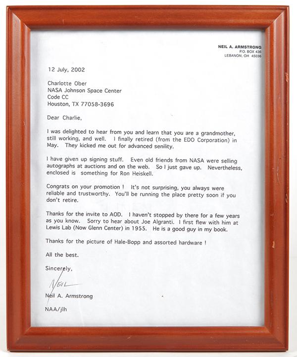 Neil Armstrong Autograph - Signed "Neil", A fun and interesting letter from "Neil" to a former coworker at NASA. Neil writes, "I was delighted to hear from you and learn that you are a grandmother, still working and well. I am finally retired (from the EDO Corporation) in May. They kicked me out for advanced senility". He goes on to say" I have given up signing stuff. Even old friends from NASA were selling autographs at auctions and on the Web. So just gave up. Nevertheless, enclosed is something for Ron…" So, in this rare case Neil did autograph an item for a friend and signed this letter "Neil".