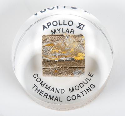 Flown Apollo 11 Thermal Coating, The Kapton foil measures 1 x 1"and is presented in a Lucite disc 2 ½" diameter, 1" thick. The engraving reads "Apollo XI Mylar Command Module Thermal Coating" A very nice presentation.