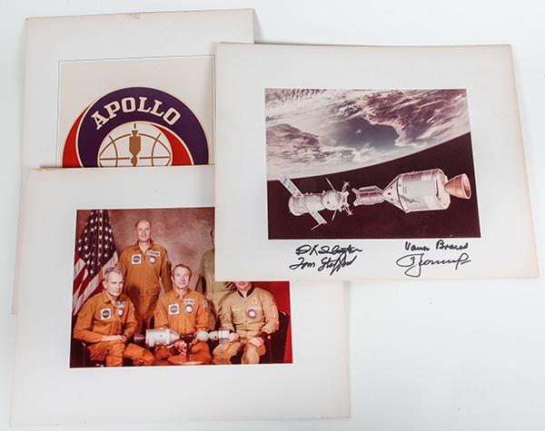 Stafford, Brand, Slayton & Leonov Autographs., On the mat surrounding a photo of an illustration showing the Apollo and Soyuz capsules about to dock. The photo measure 9.5 x 7", the mat 14 x 11". Boldly signed. Attractive. Also included are 2 other unsigned mounted photos. One is an official ASTP crew photo and the other photo is of an ASTP mission logo. Ex. the Astronaut Donald K. "Deke" Estate Collection.