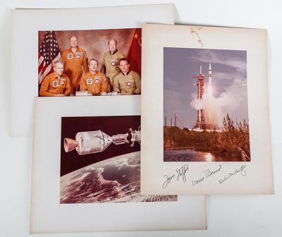 Stafford, Brand, Slayton, Autographs., On the mat surrounding a launch photo (9.5 x 7"). The mat measures (14 x 11"). Boldly signed. Attractive. Some minor staining. Also included are 2 other unsigned mounted photos. One is a photograph of an illustration of the Apollo and Soyuz capsules about to dock. The other is an official ASTP crew photo. Ex. the Astronaut Donald K. "Deke" Estate Collection.
