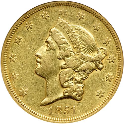 1851 $20 Liberty. NGC graded AU-53. CAC Approved. A nice untoned example with excellent fields and devices, particularly a smooth, unmarred cheek on Liberty. If one were to pick out any individual mark, there is a light chattermark within the circle of stars on the reverse, but well below the norm for these usually well-abraded big coins. In short, a very attractive offering