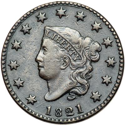 catalog Auction info Buyers Premium of 20.00% added to each and every lot June Long Beach Coin Auction(#74) 06/02/2013 11:00 AM PDT CLOSED! Lot 407 of 4868: 1821 N-2 R1 VF20 Click image to enlarge PreviousNextSimilar Items Lot closed - Winning bid:$500 (5 bids) Estimate: $300 Remove from watchlist Add to watchlist Tell a friendAsk a question June Long Beach Coin Auction(#74) 06/02/2013 11:00 AM PDT CLOSED! Description Description: 1821 N-2 R1 VF20. Glossy mix of light chocolate and darker chocolate brown. No roughness or verdigris, only minor contact marks consistent with the grade. EDS. The diagonal die line from the bust tip is clear. Estimated Value $300-UP. Ex Carvin Goodridge collection. Categories: U.S. Colonial and Copper Coins, Large Cents
