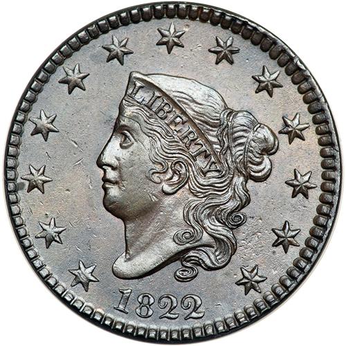 1822 N-1 R3 AU58. Lustrous steel brown and chocolate with underlying very faded mint color bleeding through in some of the protected areas on the reverse. Very attractive, just the faintest trace of friction on the highest points from mint state. Nicely struck EDS. The fields are slightly reflective and there is no trace of die rust on the reverse. A premium example of a variety that's difficult to find in high grade, this one near the bottom of the condition census.