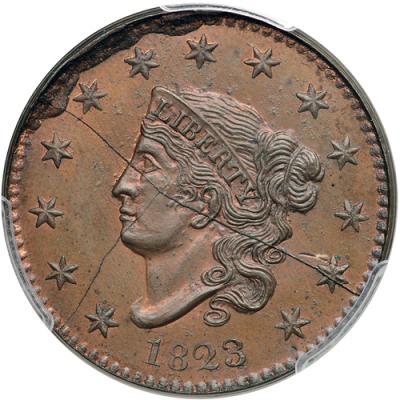 1823 Private Restrike PCGS graded MS66 Brown, CAC Approved. Lustrous steel brown and light chocolate with 20% of the faded original red remaining. No spots, stains, or contact marks. The only defect is a short struck-through line left of the upper point of star 12 (caused by a short piece of wire or thread stuck on the die). Almost perfectly centered on a flawless planchet. Quite nice for one of these "Restrike" cents, which were struck privately outside the mint circa 1862-1879 using discarded mint dies that were sold as scrap. M-LDS showing two die cracks on the obverse and a single crack on the reverse in addition to the usual die rust and rim cuds. One of the finest seen, better than any of the examples offered in the famous Dan Holmes collection (see lots 176-183 in our 5/30/2010 sale).
