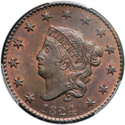 1824 N-2 R2 PCGS graded MS64+ Red & Brown, CAC Approved. Choice lustrous mint red mellowing to steel brown and olive with about a third of the faded red remaining. Satiny mint frost covers the planchet giving this cent exceptional eye appeal. A speck of dark toning nestled between the L & I in LIBERTY, another on the bottom edge of the upright of E in ONE, and a swipe of darker bluish steel toning at S-O into the wreath below are the best identifying marks. E-MDS. There is no crumbling inside the top of the 4 or inside the top of the N in CENT, but there is crumbling inside the top of the N in ONE. Called MS65 and tied for CC#1 in the Noyes census, his photo #35716. Bland says MS65 and CC#1 by itself in his census.