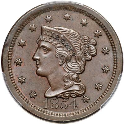 1854 N-10 R2 PCGS graded MS64+ Brown, CAC approved. Lustrous bluish steel brown and chocolate with faded mint red in protected areas on both sides. Choice and quite attractive except for a rim bruise at star 4. Sharply struck E-MDS, die state b.