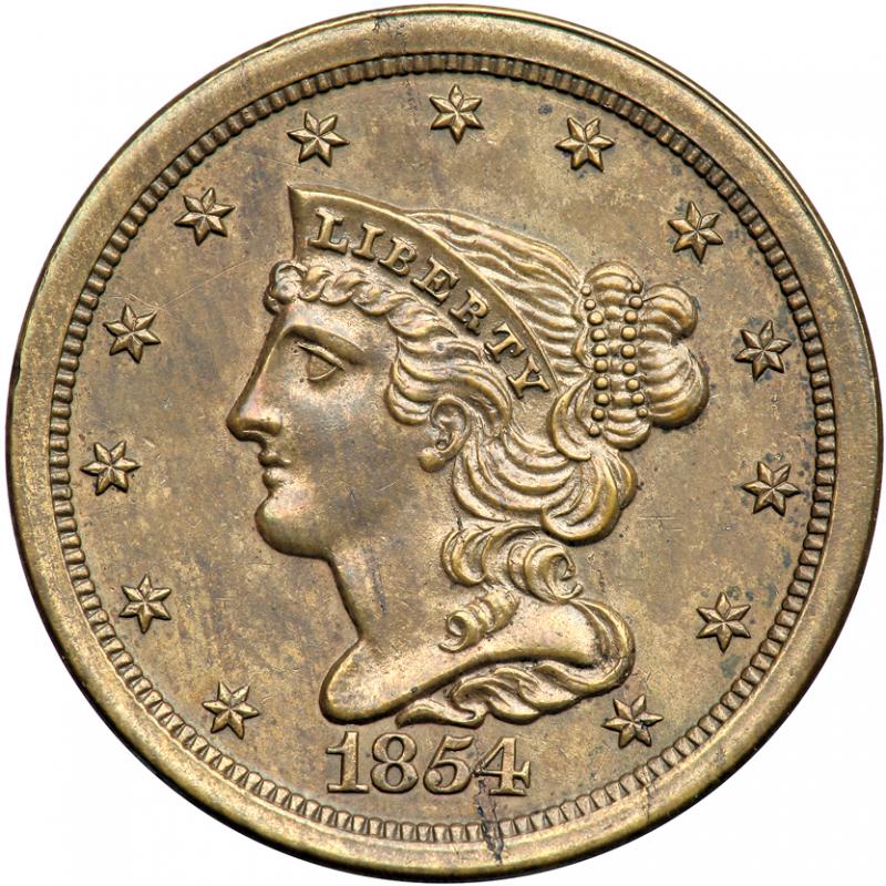 Lot 215 of 230: Coronet Head Half Cent 1854 C-1 Breen 1-B (with lump on I in UNITED) Judd-155 Unique Pattern in copper/zinc/silver alloy. PCGS P