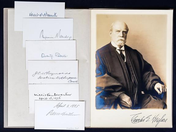 [Supreme Court] Justices Hughes, Brandeis, Cardozo, Butler, Roberts, McReynolds, & Van Devanter. Charles E. Hughes photo signed, 7½ x 11 in. A distinguished photo by Harris & Ewing, in original folder. With 4½ x 2¾ in. cards signed by