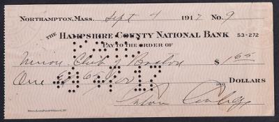 Coolidge, Calvin. Partly-printed check signed as lieutenant governor of Massachusetts, Northampton Mass., Sept. 4, 1917. Written on The Hampshire County National Bank and paid to the Union Club of Boston for $1.65. Fine; cancellation holes touch the top of the "C" in "Calvin." Estimated Value $150 - 200