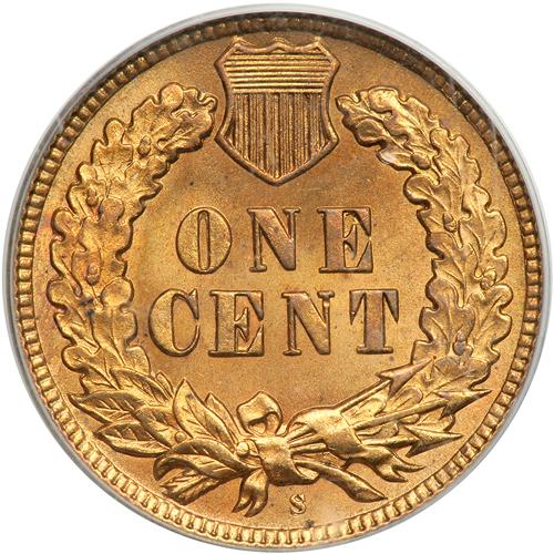 1908-S. PCGS graded MS-65 Red. Full strike with very few marks. Eagle Eye Photo Seal. Frosty in texture, the surfaces are awash in full, original, pink-red luster. Direct angles reveal smooth satin shades in all areas on the obverse and reverse; furthermore, neither side exhibits any abrasions that are out of context with the Gem MS65 grade. A powerfully struck representative of this important first-year Indian Cent. Note the sharp feather ends on the headdress, with only minor rounding on one or two.