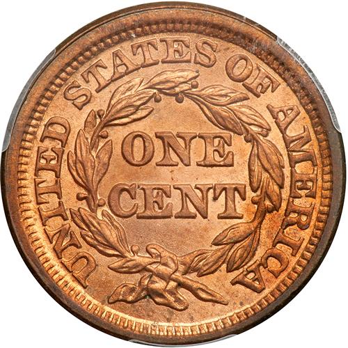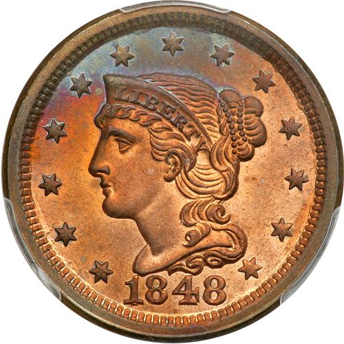 Lot 846 of 3386: 1848 N-2 R2 Boldly Repunched 18 PCGS graded MS65 Red & Brown. PCGS MS65
