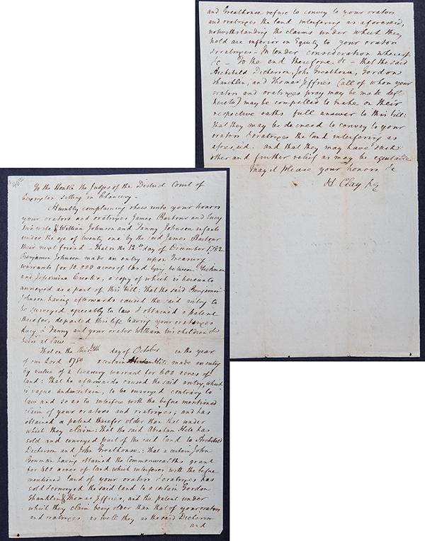 To the Honble the Judges of the District Court of Lexington sitting in Chancery"; Clay represents James and Lucy Barbour and William and Fanny Johnson in a land case. Fine.
