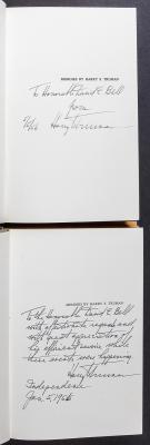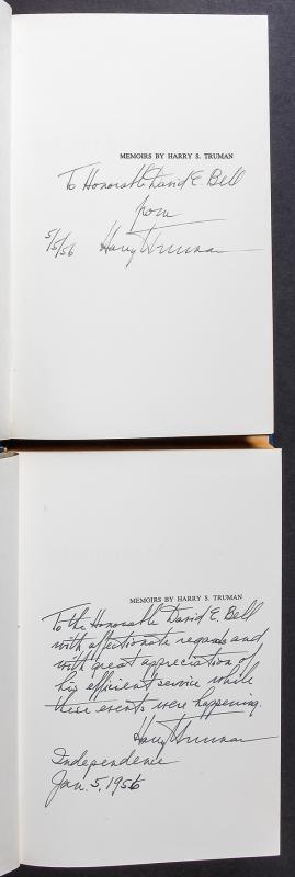 Truman, Harry S. Memoirs by Harry S. Truman, 2 volumes, both signed and inscribed on the half-title page to the Honorable David E. Bell. Volume I is inscribed, "To the Honorable David E. Bell with affectionate regards and with great appreciation of his efficient service while these events were happening. Harry S Truman / Independence / Jan. 5, 1956." Volume II is inscribed, "To Honorable David E. Bell from Harry S Truman 5/5/56." Volumes are fine, but cases for both are worn; Truman wrote Bell's name on both cases and added "From Harry S Truman" on one.