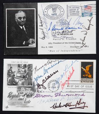Pair of U.S. Cabinet Members Signed Covers. Cover with cachet of Truman and cancelled in Washington, D.C. Dec. 26 1972, includes signatures by Tom C. Clark, W. Averell Harriman, John W. Snyder, Robert A. Lovett, Clinton P Anderson, and Charles Brannan. A 1968 First Day Cover urging "Register and Vote" includes signatures by Barry Goldwater, Strom Thurmond, Hubert H. Humphrey, George Wallace, Alf Landon, William E. Miller, John Sparkman, and others.