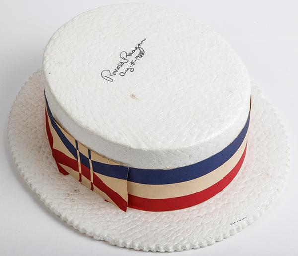Reagan, Ronald. Campaign hat signed on the crown "Ronald Reagan Aug. 15 - 1988" as President, during the Republican National Convention that took place in New Orleans in August 1988. The white Styrofoam hat has a red, white and blue paper ribbon band. There are a few tiny tears in the band, else fine.