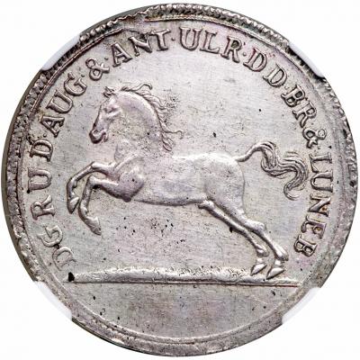 German States - Brunswick-Wolfenbüttel. 2/3 Taler, 1695-ICB. Dav-330; KM-587. Rudolf August & Anton Ulrich, 1685-1704. Leaping horse left.