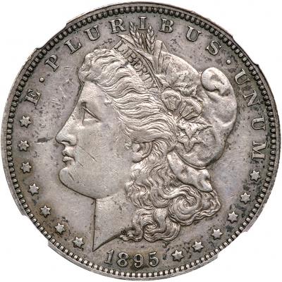 1895. NGC graded Proof 55. Only 880 minted. Popular key date. Even gray toning with reflective surfaces. Mint records show that 12,000 business strike Morgan Dollars were delivered in 1895, although not a single example dated 1895 has surfaced. Either all 12,000 coins were stored at the Mint and melted in later years, or the coins delivered were dated 1894. Regardless of which, if either, of these theories are correct, the lack of business strike 1895 Morgan Dollars has driven Proofs of this date to the pinnacle of scarcity and desirability in today's expanded hobby and rare coin portfolio allocation. Without a doubt, the Proof 1895 in this Lot is the key to the extensive and widely collected Morgan Silver Dollar series which ran from 1878 until 1921. The present lot offers a well struck, relatively damage-free quality representative whose surfaces retain their mirrors somewhat as light strikes the surface at different angles. Light marks point to it being in circulation for a year or two, perhaps longer since in most parts of the country, Silver Dollars were used much by the public. Interesting light to medium gray toning is seen at all angles with sharp devices throughout. Proof 1895 Silver Dollars were boldly struck as a rule, with no outwardly weak areas. We foresee elevated bidder demand for this lightly circulated yet still very appealing Proof 55