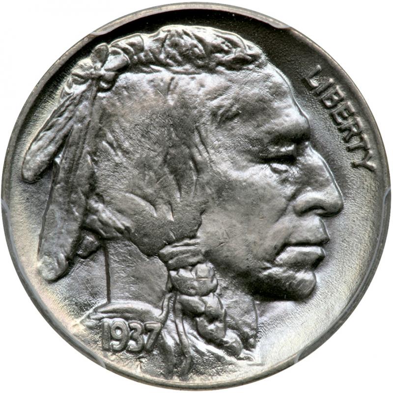 1937. PCGS graded MS-68. Mostly untoned with a hint of light tone. A wonderful coin. Tied for Finest. It appears that even the artist who designed this piece, James Earle Fraser, preferred the familiar term "buffalo" to the more zoologically correct bison. Semantics aside, the model for the nickels reverse is known to have been a bull named Black Diamond. This animal was then a resident of New York Citys Central Park Zoo and was already about seventeen years old at the time. Frasers own correspondence reveals his exasperation in attempting to keep this beast posed in profile as depicted on the coin. Evidently quite uncooperative, it insisted on confronting the artist head on and would return to this stance immediately after being corrected.