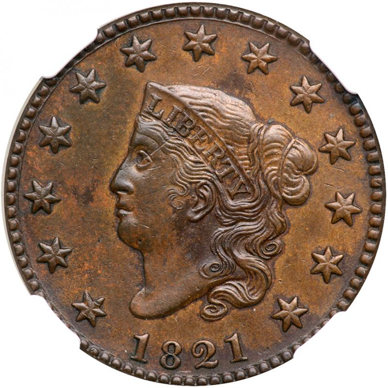 1821 N-2 R1. NGC graded MS-62 Brown. Glossy mix of light brown and darker chocolate. Sharply struck and attractive but not quite perfect. There is a faint diagonal planchet void passing through the eye and tiny traces of extremely fine roughness can be found hidden under the toning on the obverse. None of these defects are visible to the unaided eye. MDS. The die line from the bust tip that shows in the early state is gone but there is no crumbling in the dentils at stars 6 & 7.