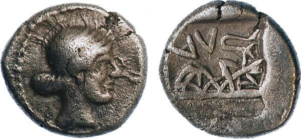 Lot 104 of 1755: Thessaly, Larissa (c.479-460 BC), Silver Obol, 0.80g, 11h. Head of the nymph Larissa facing right. Rev. Sandal of the he