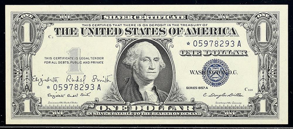 catalog Auction info Buyers Premium of 20.00% added to each and every lot September Pre-Long Beach(#60) 09/19/2010 1:00 PM PDT CLOSED! Lot 2137 of 3814: 1957-A, $1 Silver Certificate. Star Note, Courtesy Autograph. PCGS Currency Gem New 65PPQ Click image to enlarge PreviousNextSimilar Items Lot closed - Winning bid:$60 (1 bid) Estimate: $100 - $125 Remove from watchlist Add to watchlist Tell a friendAsk a question September Pre-Long Beach(#60) 09/19/2010 1:00 PM PDT CLOSED! Description Description: 1957-A, $1 Silver Certificate. Star Note, Courtesy Autograph. PCGS Currency Gem New 65PPQ. Fr-1620*. KL-1463*. A lovely Gem star note that was personally signed by Treasurer Elizabeth Rudel Smith. Estimated Value $100 - 125. Categories: Silver Certificates - Small