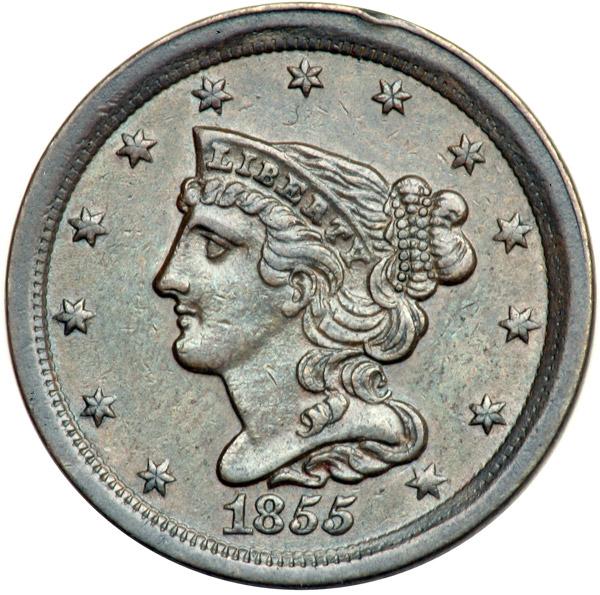 catalog Auction info Buyers Premium of 20.00% added to each and every lot September Pre-Long Beach(#60) 09/19/2010 1:00 PM PDT CLOSED! Lot 365 of 3814: 1855 C-1 R1 EF45. Click image to enlarge PreviousNext Lot closed - Winning bid:$210 (7 bids) Estimate: $200 Remove from watchlist Add to watchlist Tell a friendAsk a question September Pre-Long Beach(#60) 09/19/2010 1:00 PM PDT CLOSED! Description Description: 1855 C-1 R1 EF45. Incuse Stars on Reverse Rim. Frosty light olive brown and chocolate. Satiny mint luster covers the protected areas on both sides. Great eye appeal for the grade. A small rim nick over the left side of star 8 is the best identifying mark. There are two incuse stars on the rim over TES in STATES. These are consistent with an obverse brockage impression, but there is no other evidence of a second strike on the reverse. However, the dentils on the opposing part of the obverse (from under the date up to star 3) are doubled on their tips. There is no trace of damage that might suggest the incuse stars were made by pressing a struck piece against this one post striking. So I have to conclude the incuse stars came from a brockage impression. MDS. Davy #55.1.9. Estimated Value $200-UP. Ex Don Valenziano 8/3/90. Categories: