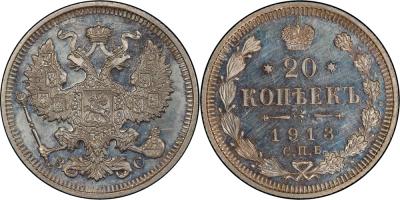 Lot 2408 of 1725: Nicholas II, 1894-1917, 20 Kopecks 1913 ÑÏÁ-?Ñ. Bit 115, Uzd 2200. Authenticated and graded by PCGS PR 62 CAMEO.Brillian