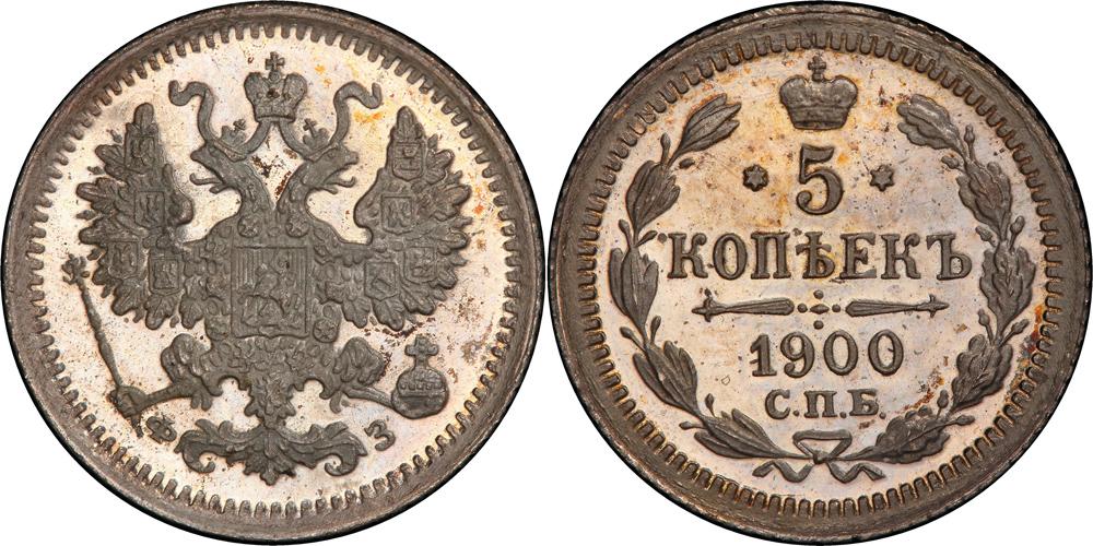 Lot 2437 of 1725: Nicholas II, 1894-1917, 5 Kopecks 1900 ÑÏÁ-ÔÇ. Bit 175, Uzd 2216. Authenticated and graded by PCGS PR 65 CAMEO.Gem brill