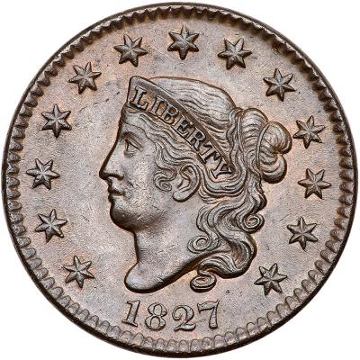 Lot 454 of 3524: 1827 N-11 R1 PCGS graded AU58, CAC Approved