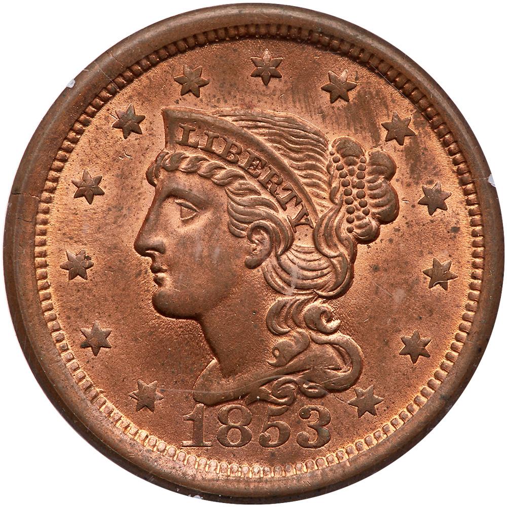 Lot 441 of 3706: 1853 N-25 R1 Repunched 1 PCGS graded MS64 Red & Brown (OGH)