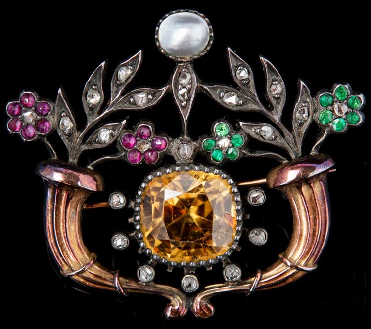 Lot 529 of 1019: Rare 19th Century Victorian Citrine, Ruby, Emerald, Pearl and Diamond Brooch in 14K Rose Gold