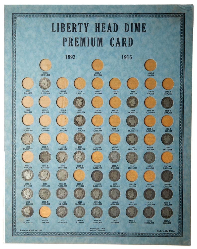 Lot 1077 of 2595: A Liberty Head Dime Coin Board made by J. Oberwise in 1938